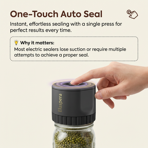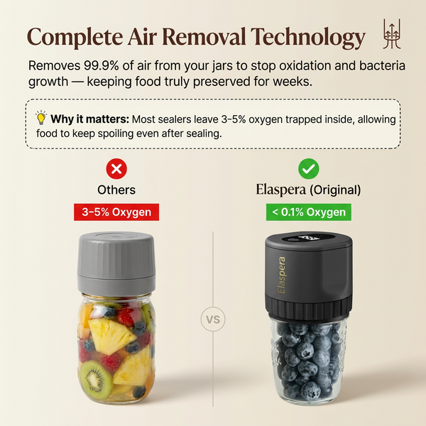 With regular storage, oxygen slowly breaks down your food — causing browning, texture loss, and wasted money. Elaspera VakuSeal removes up to 99.9% of air, dramatically slowing oxidation and preserving freshness for days longer. The difference isn’t subtle — it’s visible, and you can taste it.
